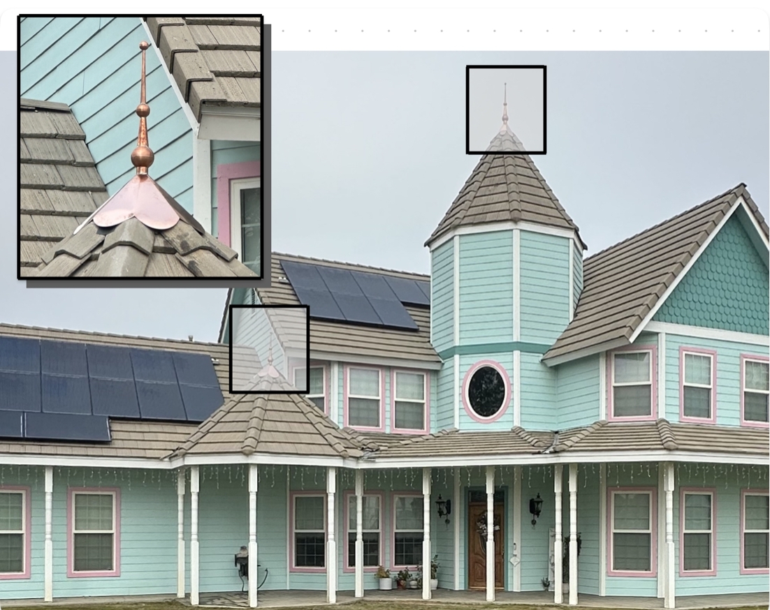 I thought you might like to see pictures of the weathervane once it finally was installed on our new house in Arroyo Grande, California. I want to thank you again for the great costumer service we received. If you will recall we had two weathervanes damaged in transit with the third one finally making it undamaged. You were very helpful and quick to replace the damaged units.