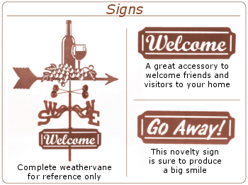 ADD A SIGN UNDER YOUR STEEL WEATHER VANE FOR A SPECIAL GREETING FOR FRIENDS AND VISITORS You can add a sign that spells out a warm greeting or a whimsical message that will surely bring a smile to the face of your friends or visitors. The sign is mounted underneath the directionals and is color coordinated with your choice of either satin black or copper tone vanes. There are two signs available "Welcome" and "Go Away!". The signs add a nice custom touch to any vane selection. |